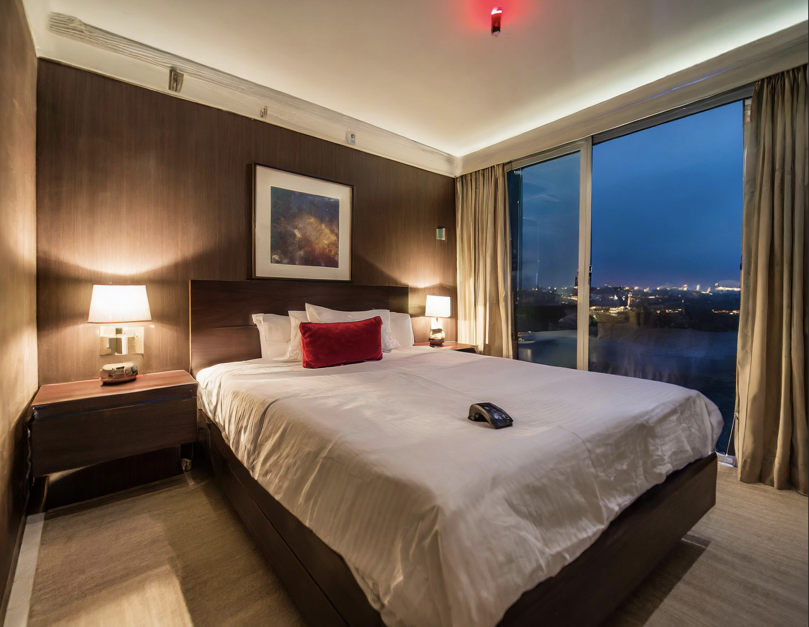 Installation piece involving a simulated hotel room, with art on the walls and a double bed in the room. Participants in the installation are invited to lie on the bed. Above the bed is a smoke detector with a small red LED. The LED is being controlled by an artificial intelligence system designed by the artist.